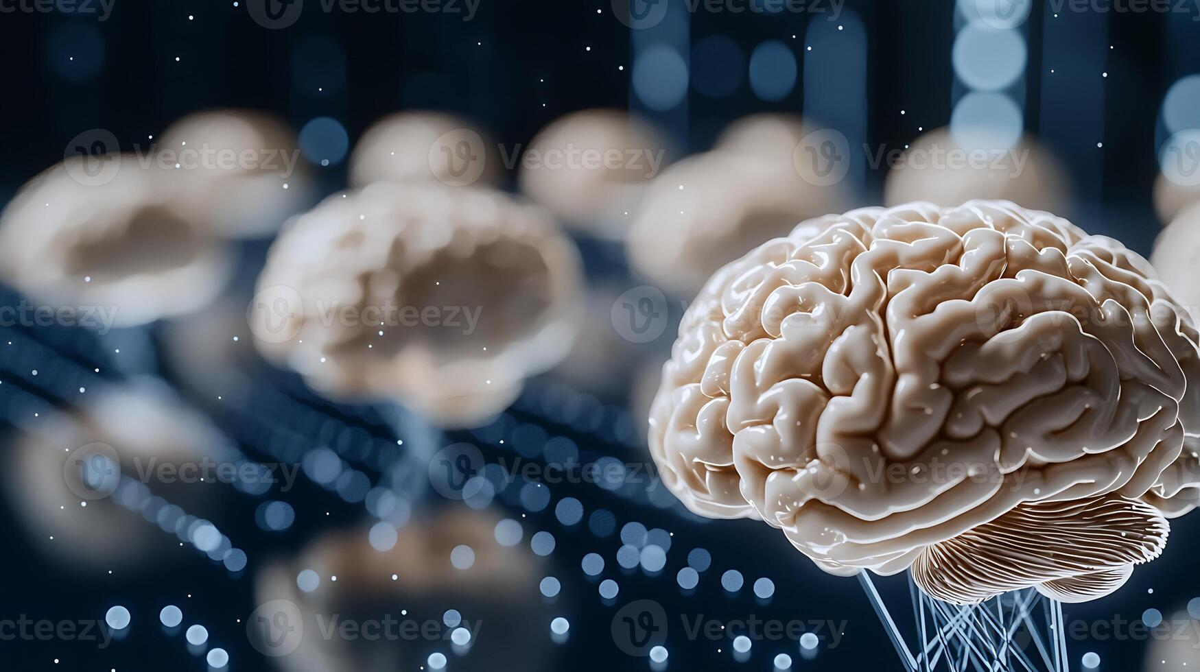Close-up view of multiple human brains connected by glowing neural pathways in a digital environment Pro Photo