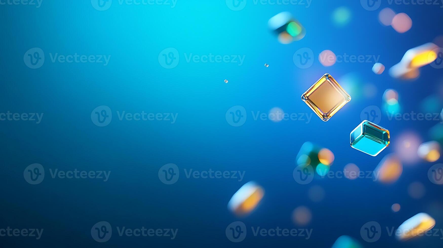 Colorful geometric shapes floating in a serene blue background, creating a dynamic visual effect Pro Photo