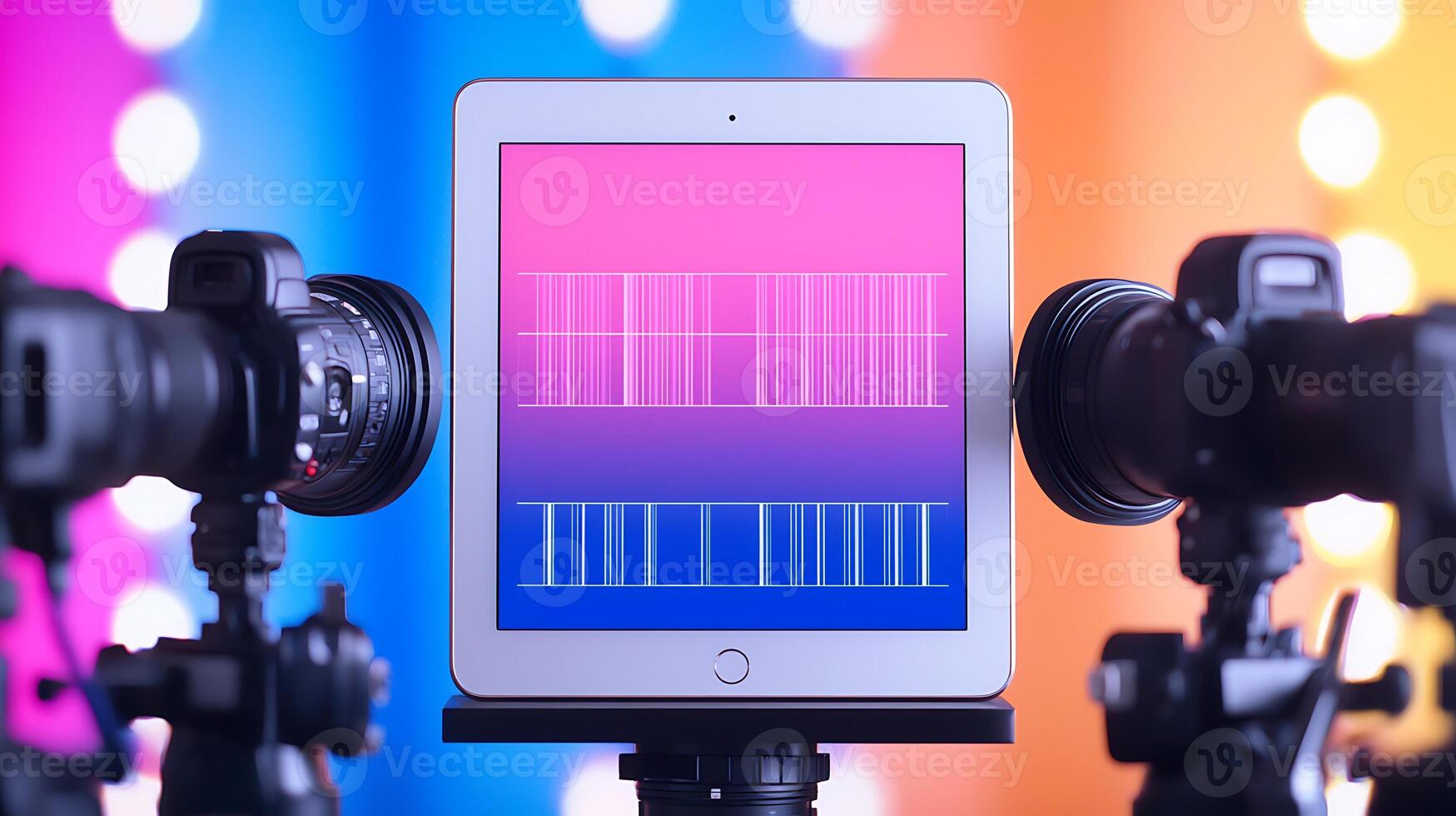 Two cameras positioned on either side of a tablet displaying colorful wave patterns, studio setting Pro Photo