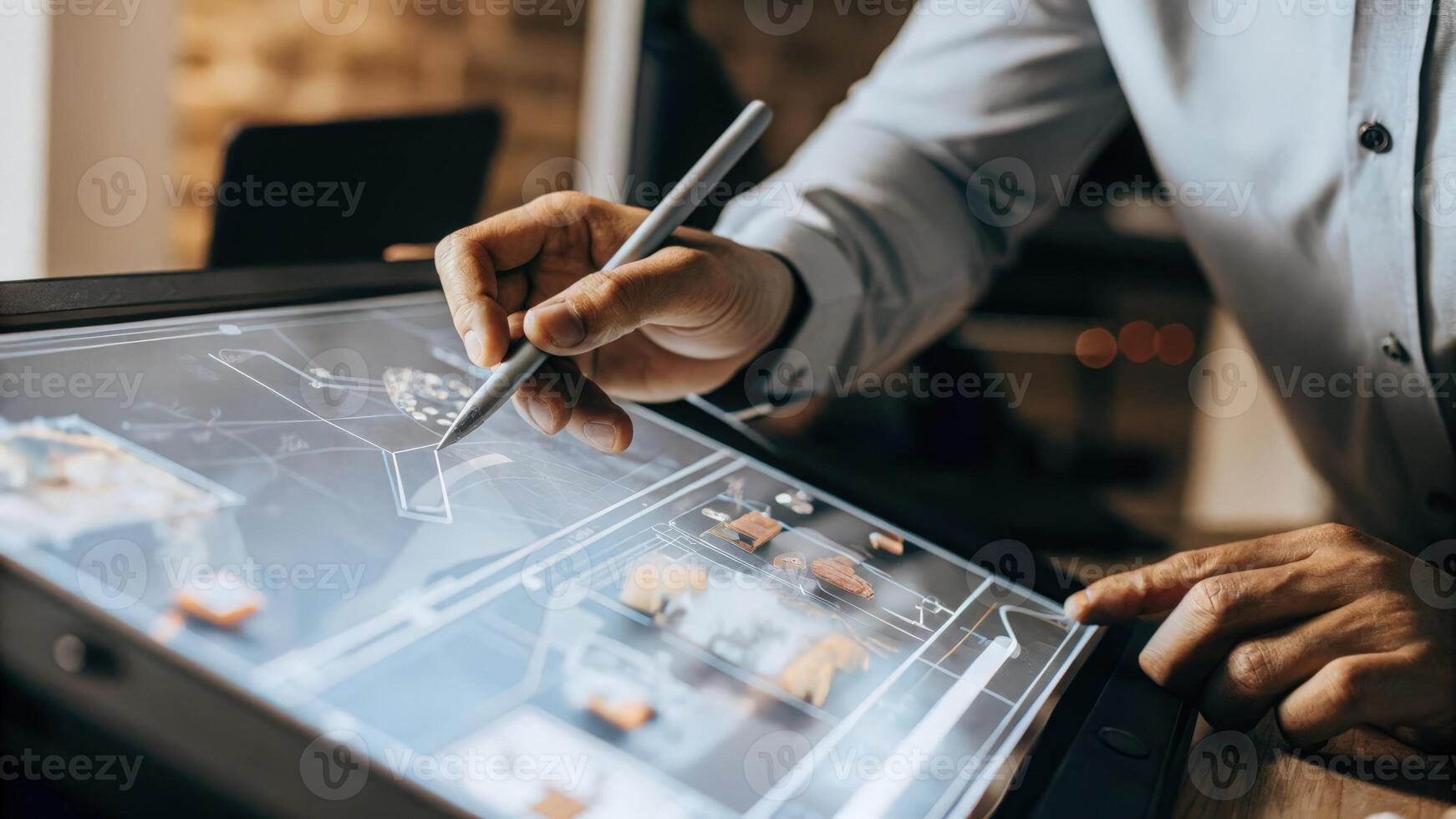 A professional uses a stylus to draw on a holographic dashboard which instantly updates a 3D model illustrating logistical operations and supply chain dynamics.. Pro Photo