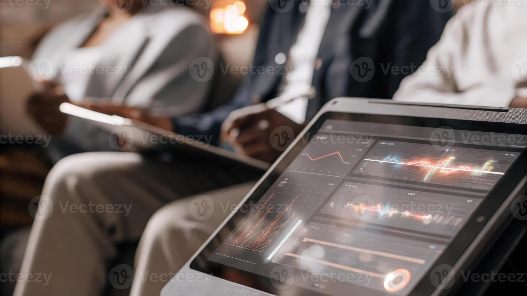 Closeup of a holographic interface displaying an interactive sales pipeline with animated statistics and graphs while participants actively take notes.. Pro Photo