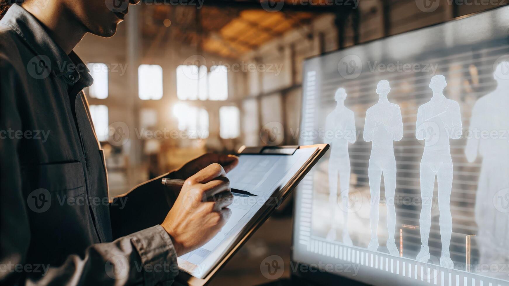 A focused employee takes notes while analyzing a holographic performance summary in a welllit open space with floating figures showing productivity trends and insights.. Pro Photo