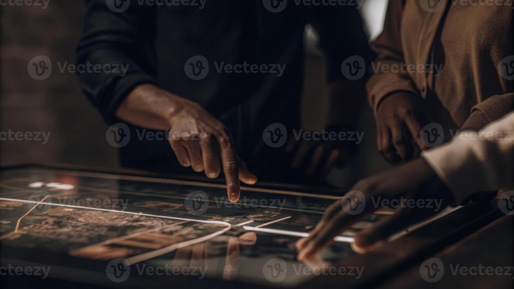 A closeup of a holographic interface showing interactive maps of renewable energy installations with users zooming in and out with hand motions to analyze data points.. Pro Photo
