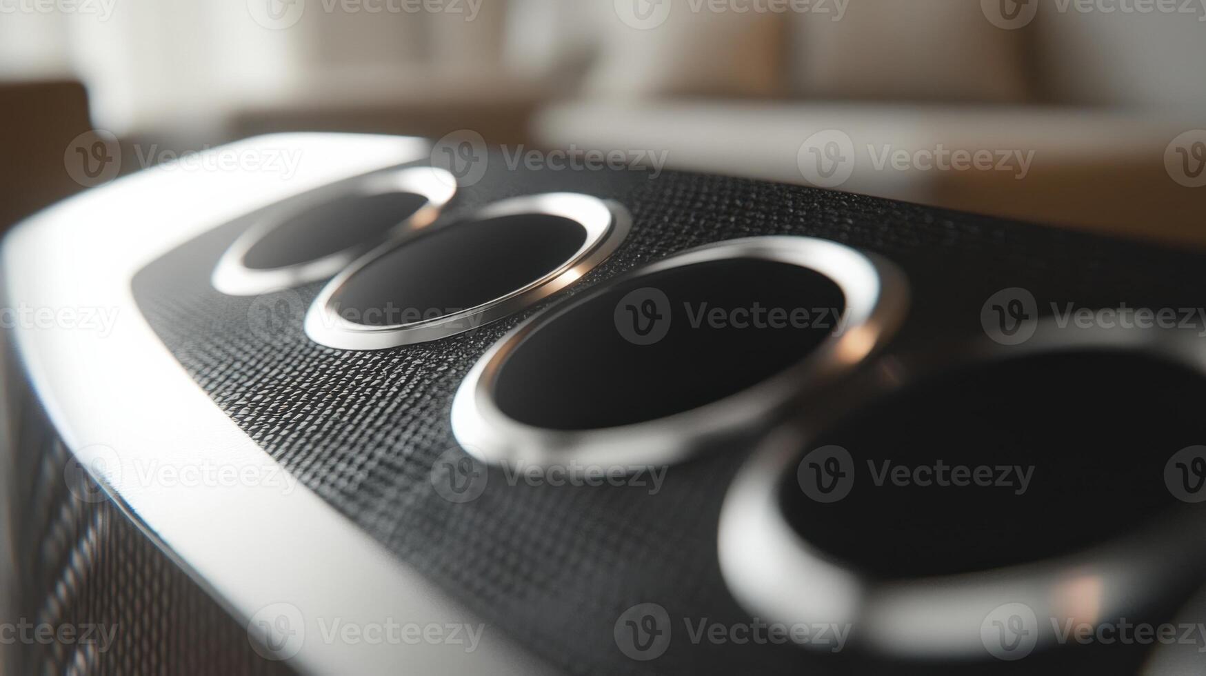 A closeup of highfidelity speakers arranged strategically in a modern living space illustrating the seamless integration of a wireless audio system with multiple outputs emphasizin Pro Photo