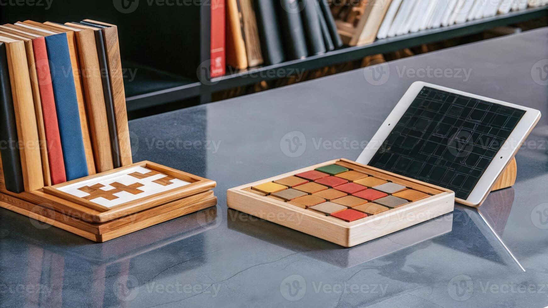 An assortment of brain training tools arranged aesthetically on a polished tabletop including interactive puzzles interactive screens and cognitive enhancement literature inviting. Pro Photo