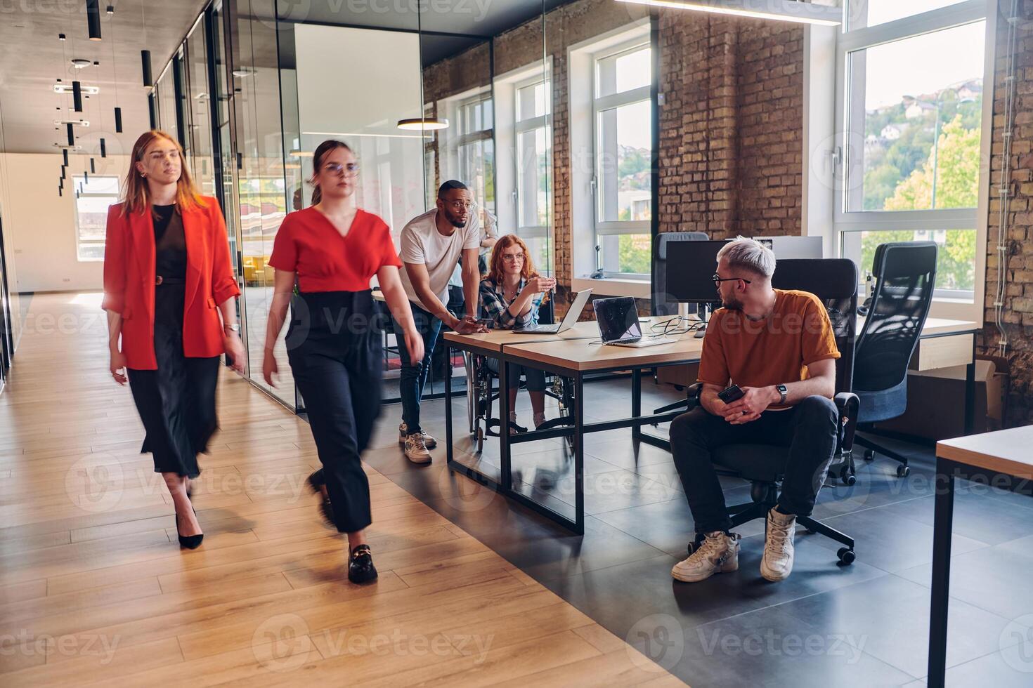 A diverse group of business professionals collaborates in a modern startup coworking center, utilizing a mix of paper-based and technological tools such as mobile phones and computers to collectively Pro Photo