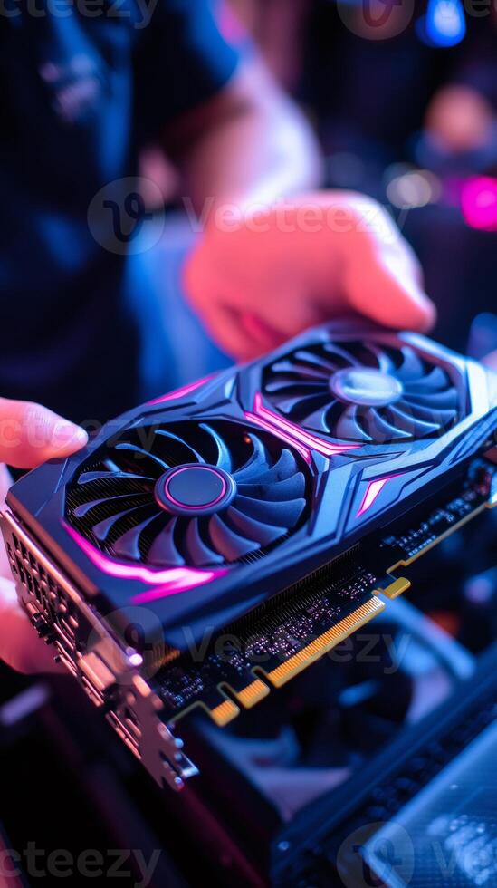 Technician installing new powerful graphics card in desktop computer Pro Photo