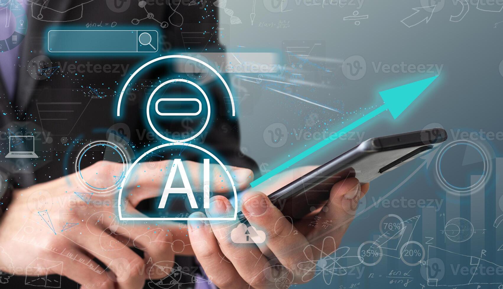 Human interact with AI artificial intelligence brain processor in concept of AI artificial intelligence engineering, big data and AI machine learning to use for business support. Faas Pro Photo