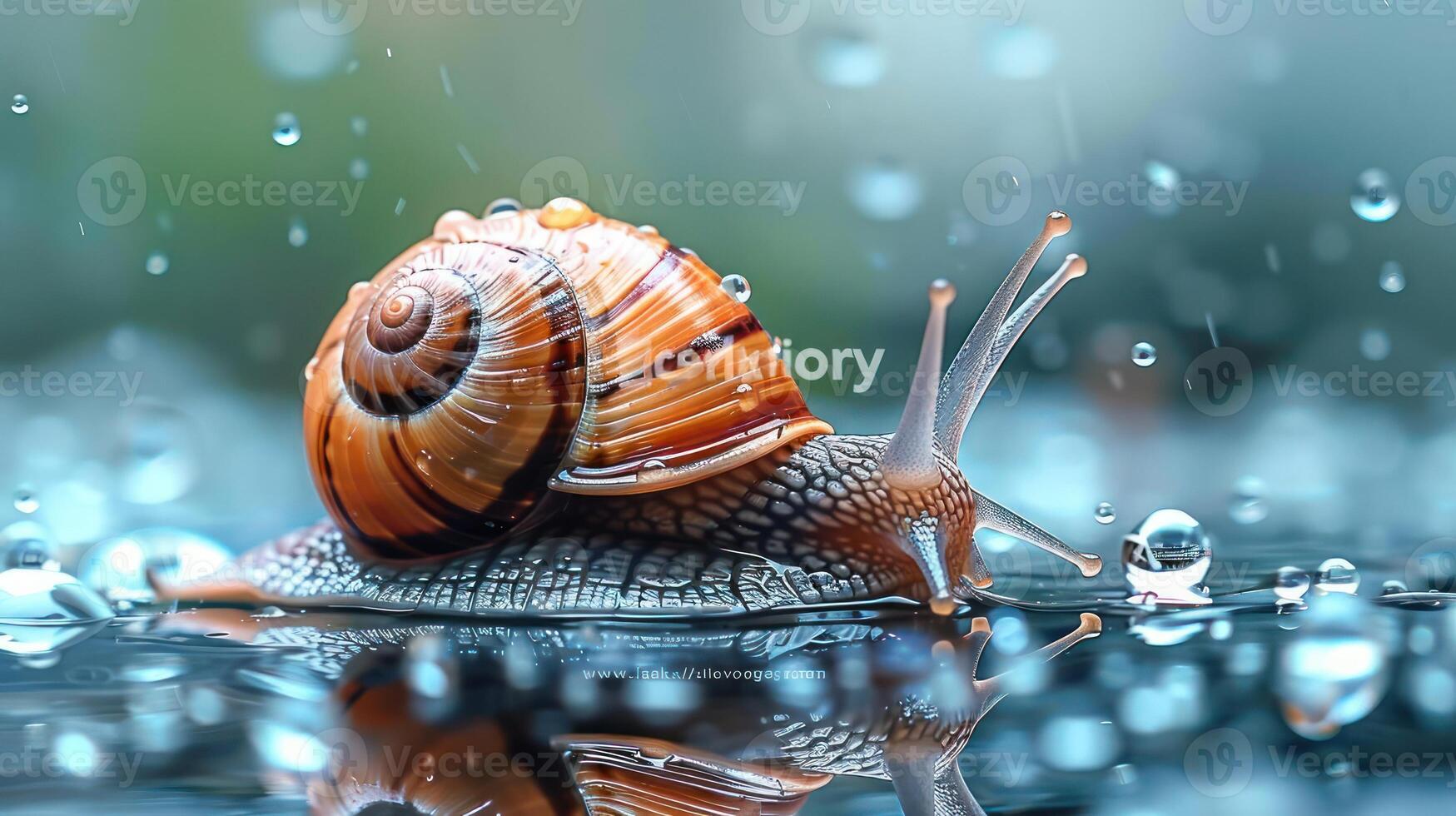 Close-up photograph of a snail with its shell and antennae visible, set against a blurred background. Pro Photo