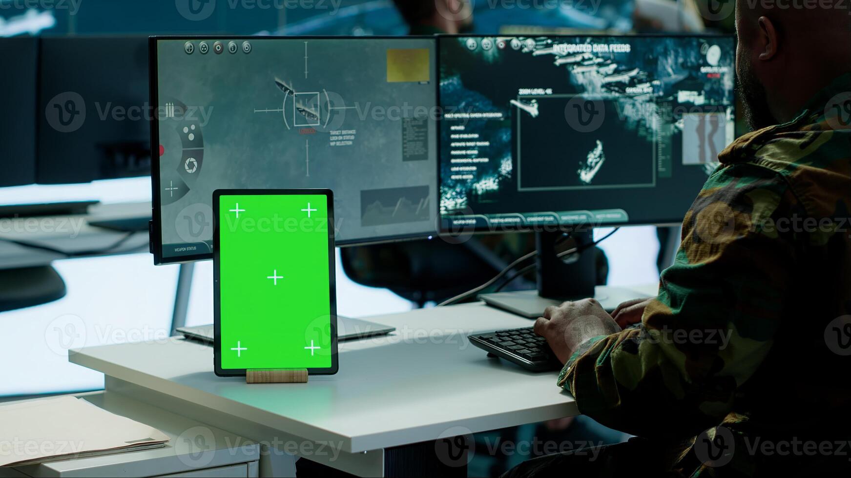 Military team operating in a high tech command post control tower, focusing on surveillance tactics for intelligence gathering. Data protection to manage critical information operations. Camera B. Pro Photo