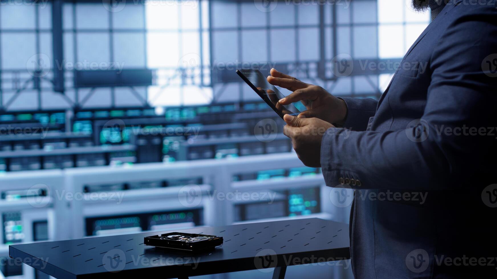 Technician in server hub workplace installing newly ordered storage unit, checking parameters with tablet. IT expert in data center holding device, replacing storage mainframes components, camera A Pro Photo
