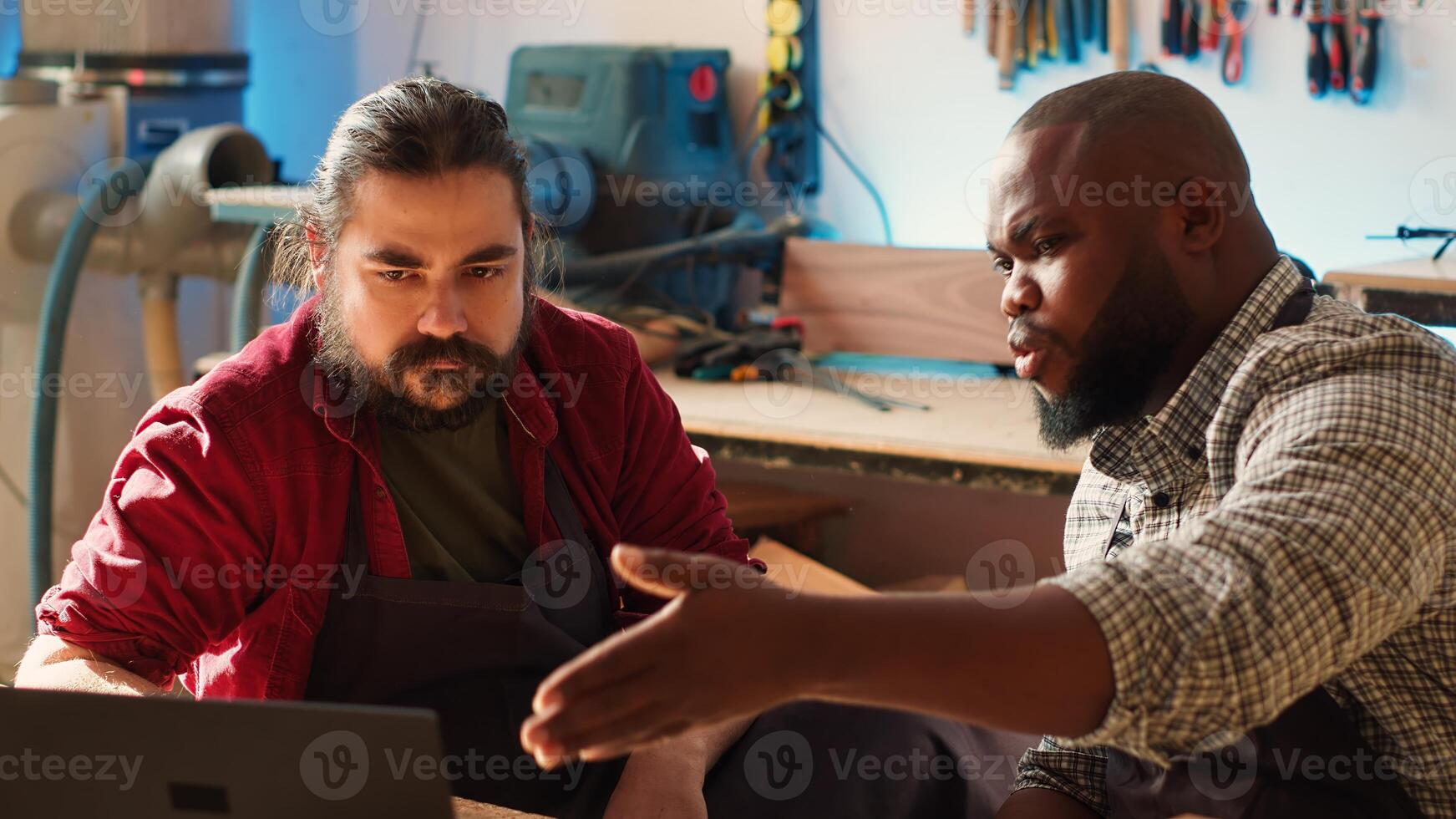 Woodworkers using CAD software on laptop to design wooden objects, pointing towards screen. Carpenters using program on notebook to help them do furniture assembling in joinery, camera A Pro Photo