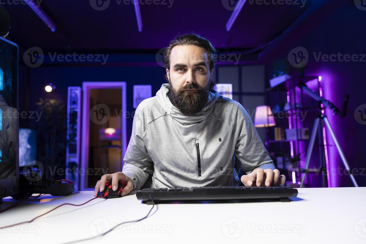 Focused man using gaming mouse and keyboard to shoot enemies in videogame. Gamer using powerful PC and computer peripherals, concentrating on competing in multiplayer game Pro Photo