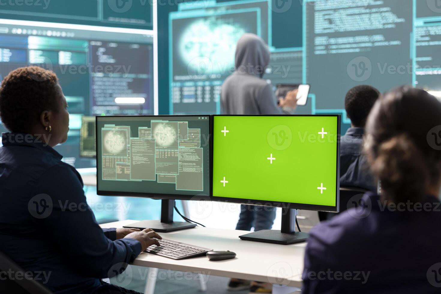 Governmental hackers using green screen in performing cyber security monitoring and threat detection. Examining network security and protection against cyber attacks, national intelligence. Pro Photo