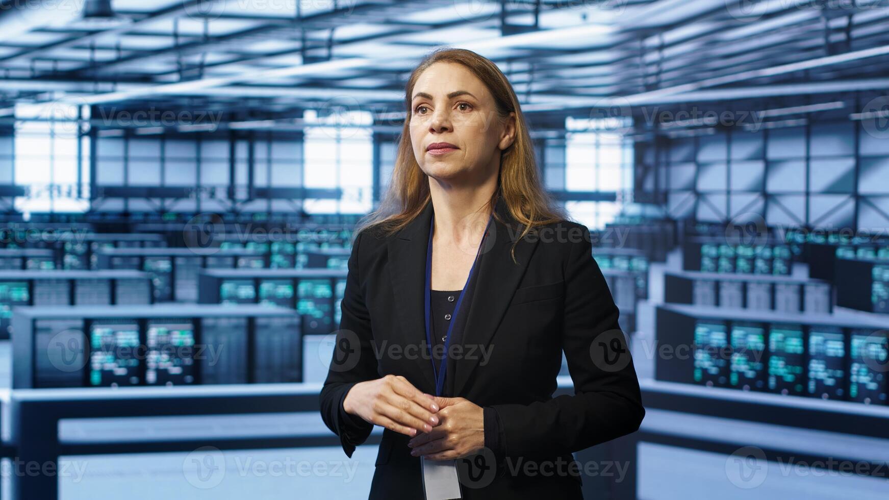 System administrator in high tech data center looking at hologram visualization. Computer scientist working on securing server terminals using AR tech, preventing hacker attacks, camera A Pro Photo