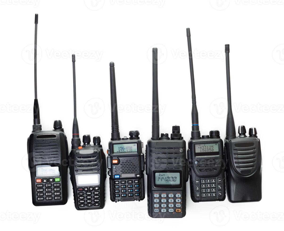 Multiple models of handheld walkie-talkies arranged in a row showcasing different designs and features Pro Photo