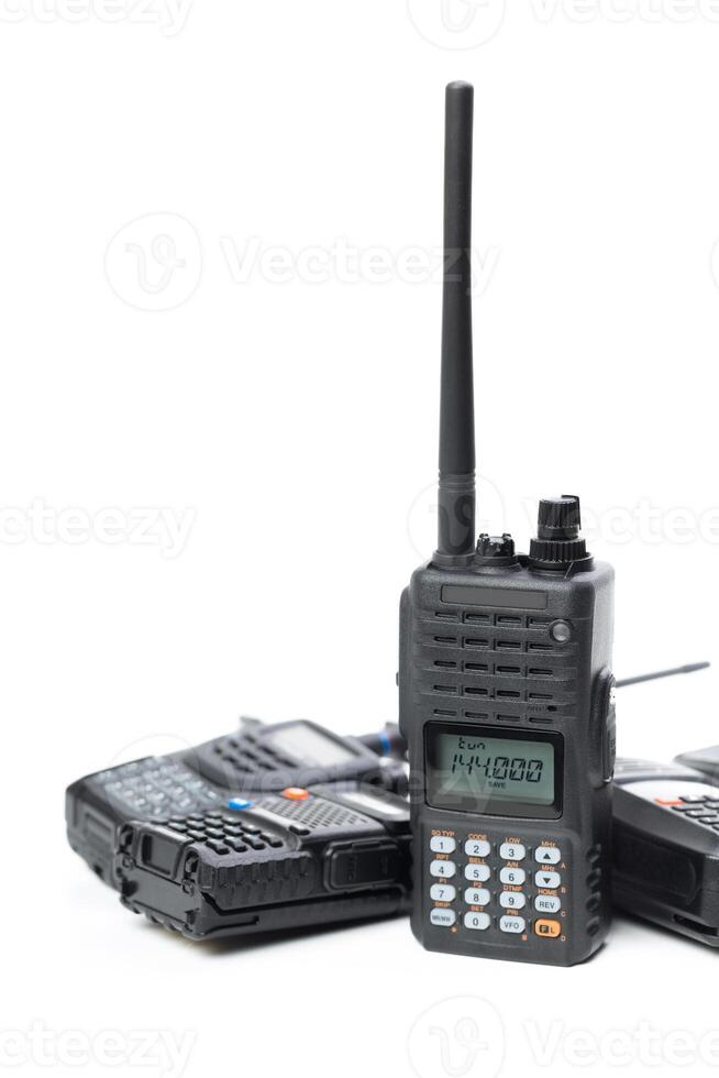 Multiple handheld radios stacked together with a prominent display unit resting on top in a bright setting Pro Photo