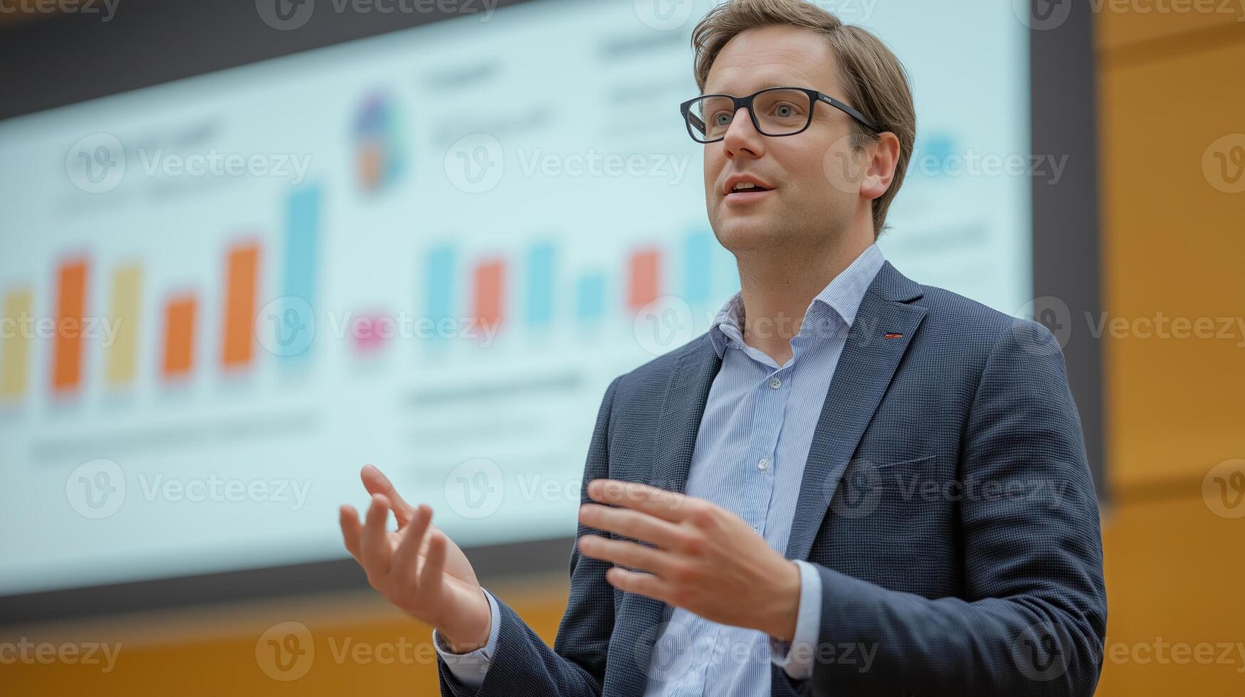 Confident Executive Leading a Presentation with Interactive Data Visuals Pro Photo