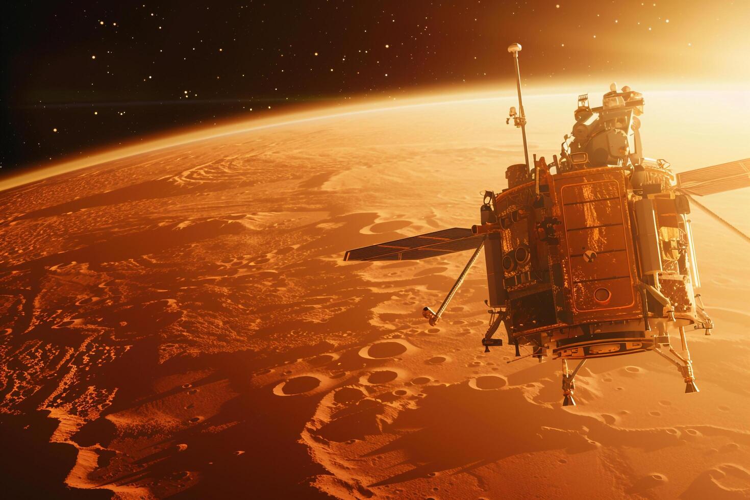 Interstellar Background Space Exploration Exploration Spacecraft Orbiting Mars Capturing Panoramic of the Red Planet Free Photo