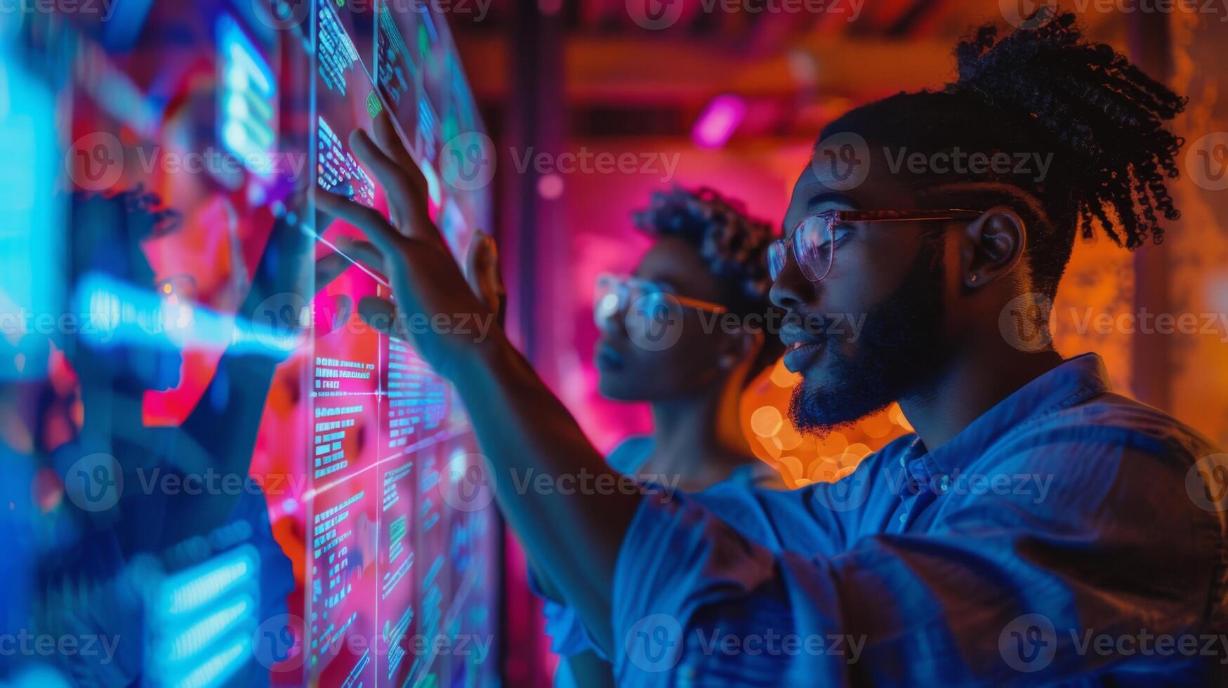 Two individuals focus intently on a digital display, interacting with data in a modern technology lab filled with colorful lighting, creating a dynamic atmosphere. Pro Photo