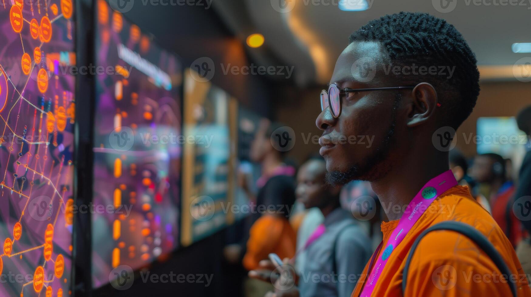 Attendees observe dynamic digital displays showcasing technology at an innovation expo. The atmosphere buzzes with curiosity and learning in an urban setting. Pro Photo