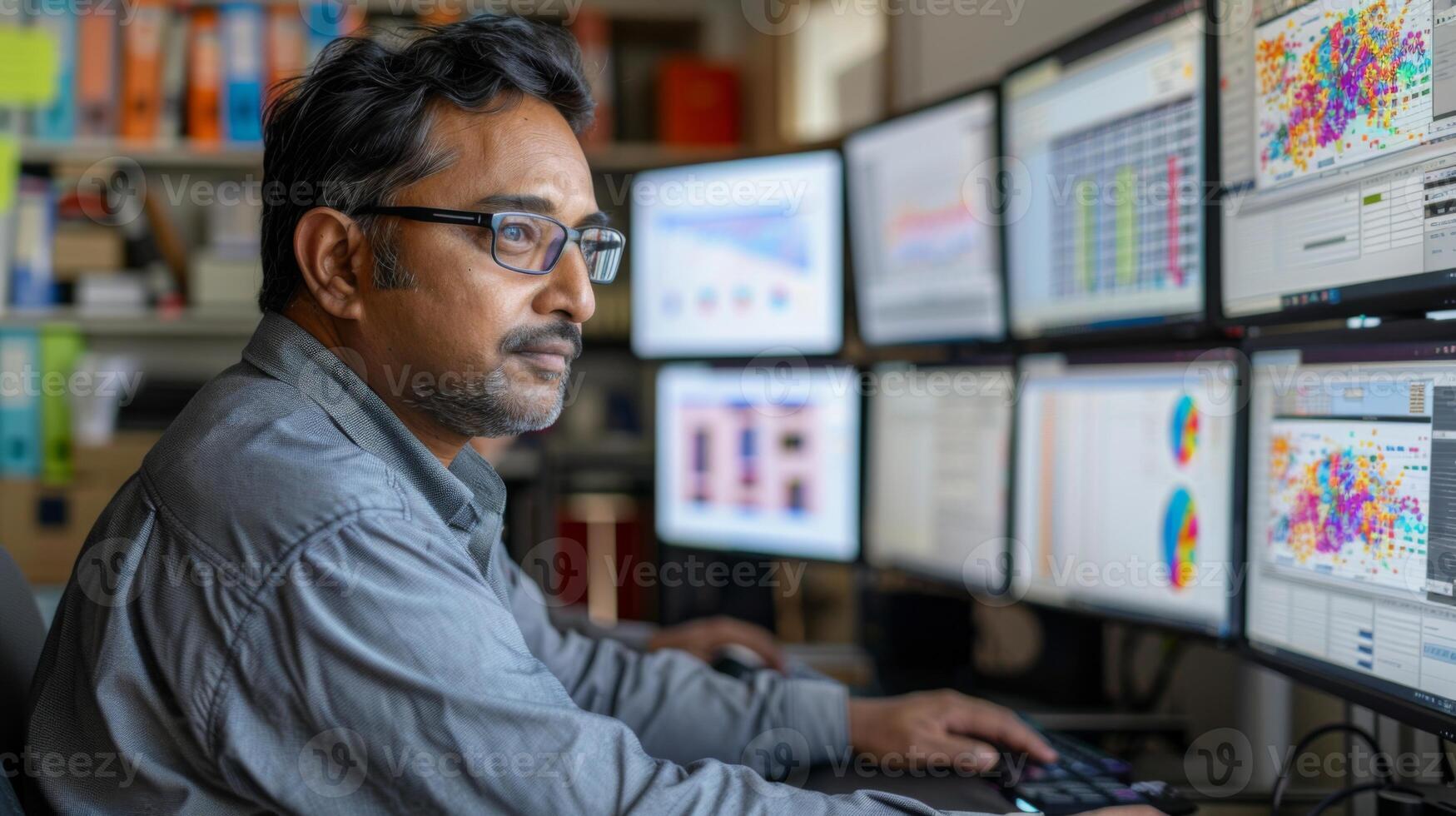 Man focused on analyzing data trends while seated at a desk surrounded by multiple computer monitors showcasing various graphs and charts in a bright office setting. Pro Photo
