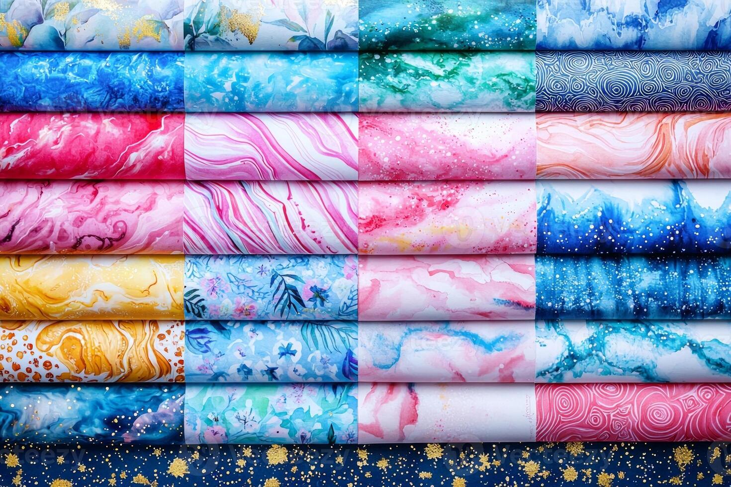 Set of neatly arranged business cards featuring vibrant abstract designs is displayed from top down view on polished marble surface emphasizing modern aesthetics Pro Photo