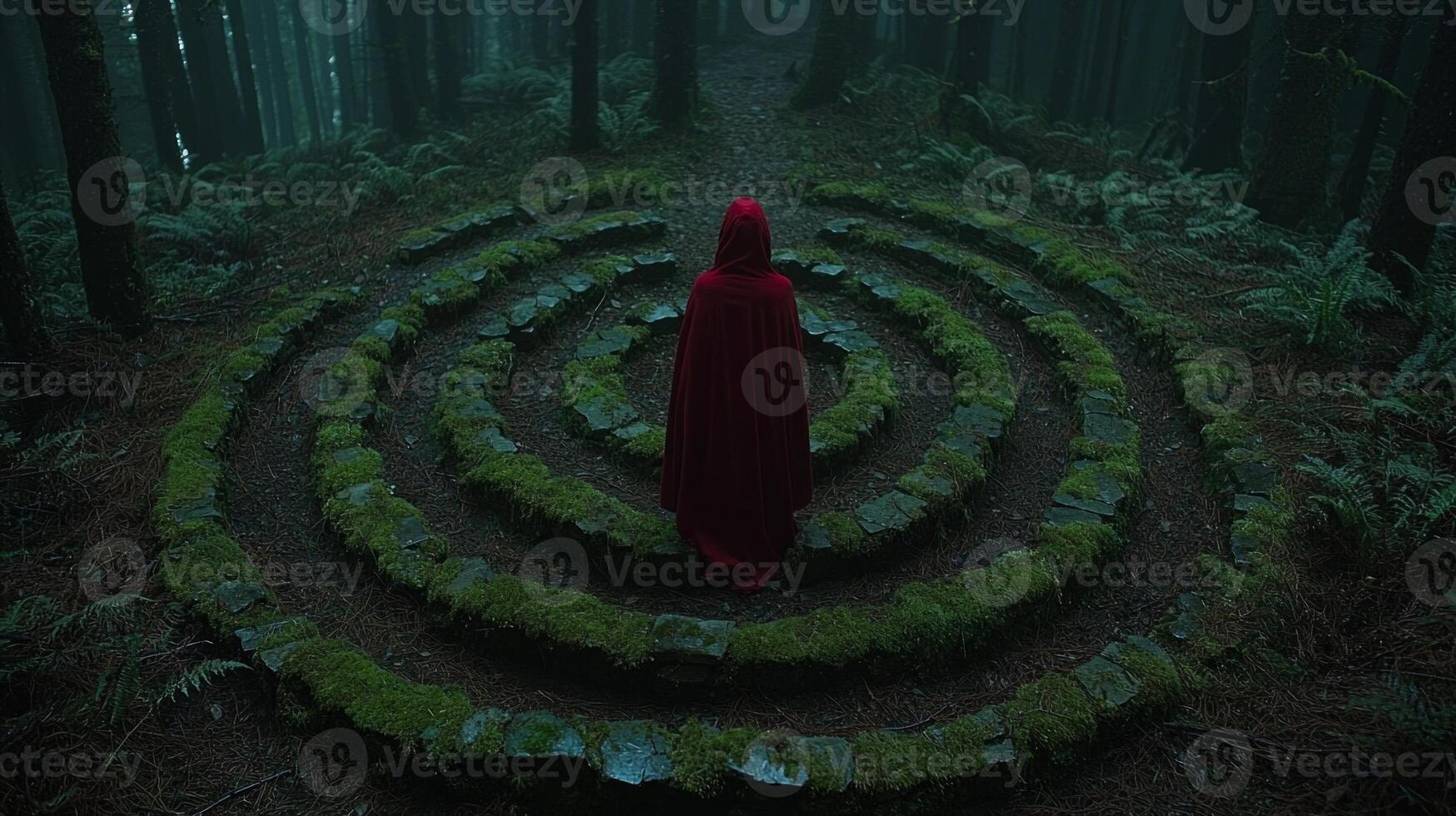 person in flowing red cloak stands crossroads within moss covered labyrinth surrounded towering trees and mist pondering which path choose in magical forest Pro Photo