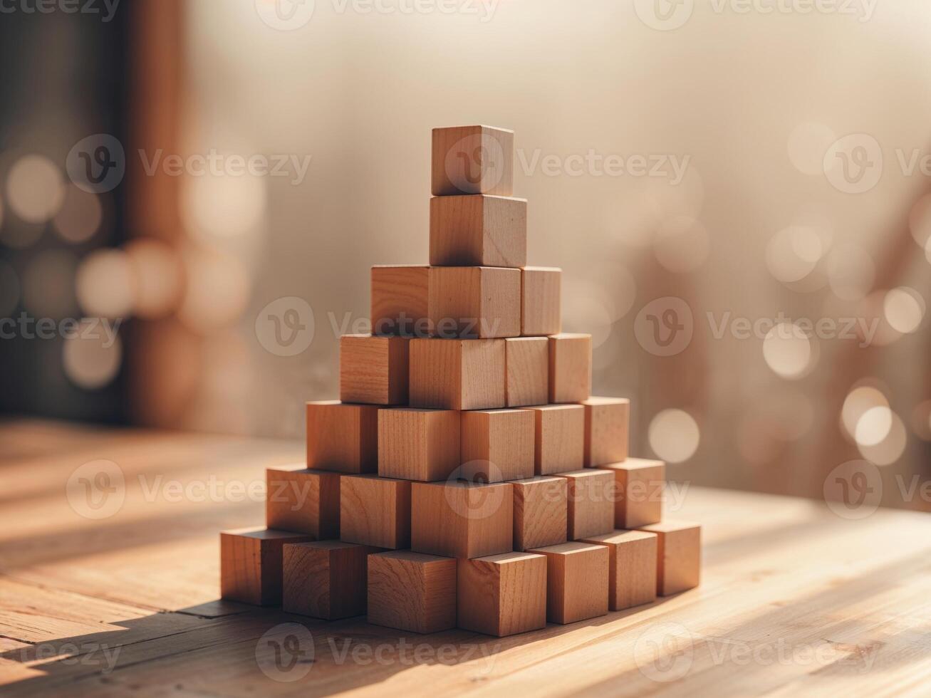 Arrangement of Wooden Cubes Forming a Pyramid on Table with Soft Focus Background and Natural Lighting Ideal for Creative Projects and Educational Use. Pro Photo