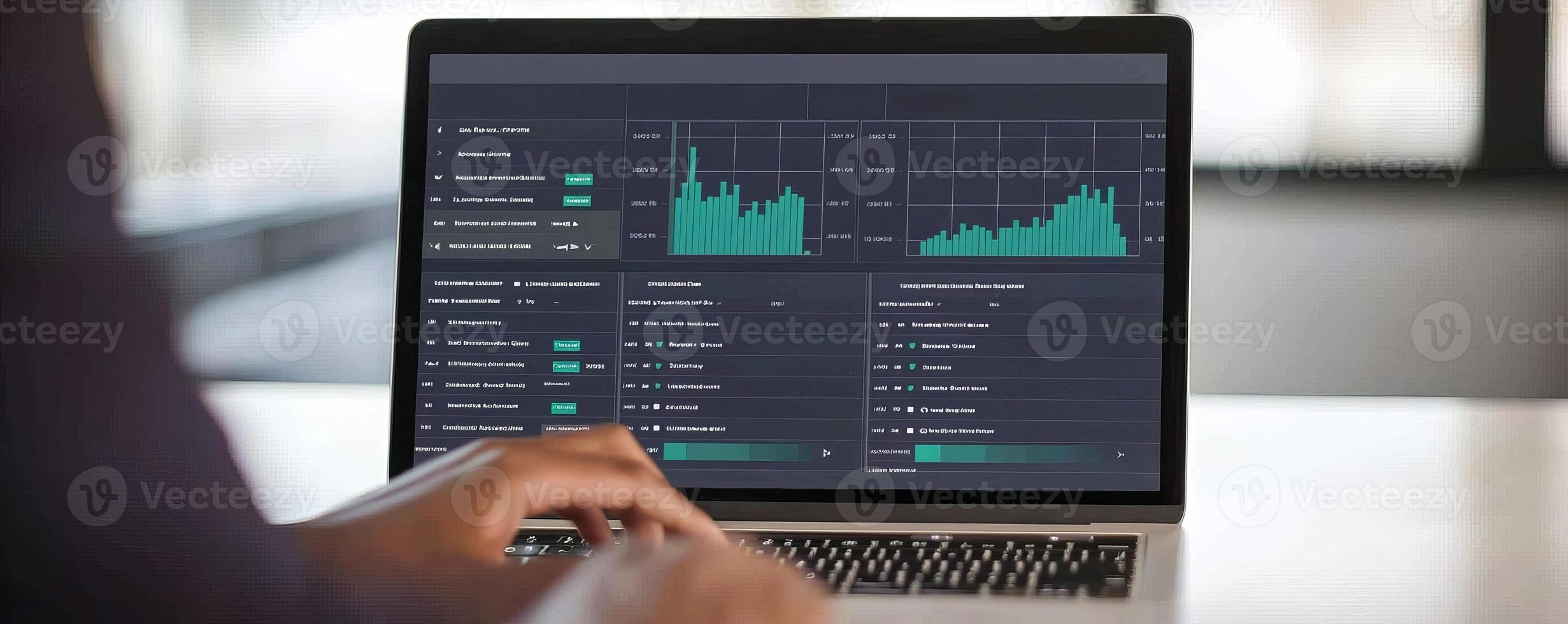 Marketing analytics consumer optimization concept. Analysis of data on a laptop screen with financial graphs and statistics. Pro Photo