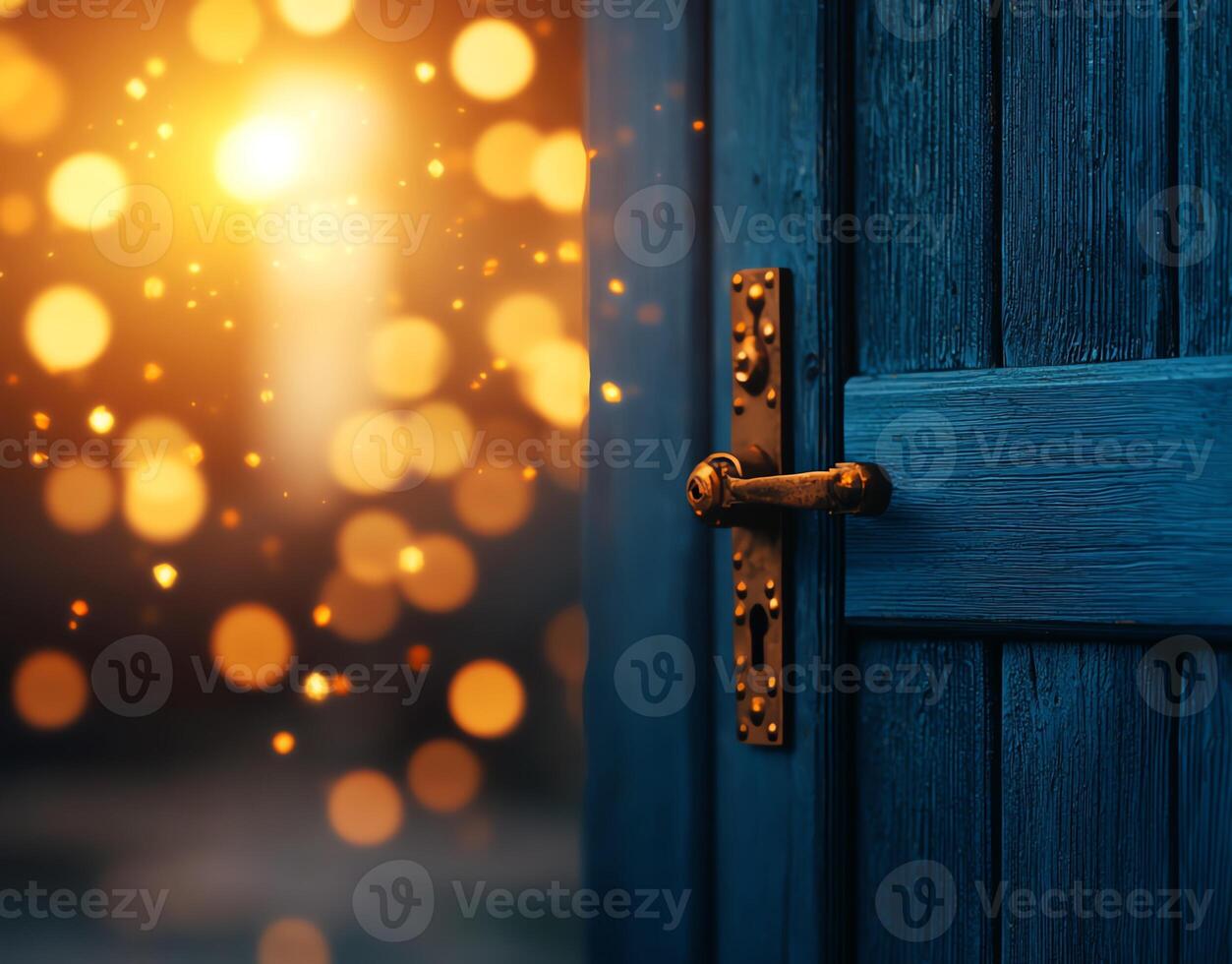 An enchanting blue door adorned with a golden handle opens to a world of soft bokeh lights, symbolizing new opportunities and inviting warmth into the space beyond. Pro Photo