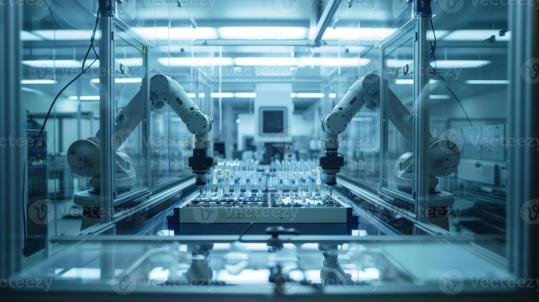 Robotic arms are carefully assembling components on a conveyor in a high tech factory. Bright lighting highlights the precision of machinery and organized workflow. Pro Photo