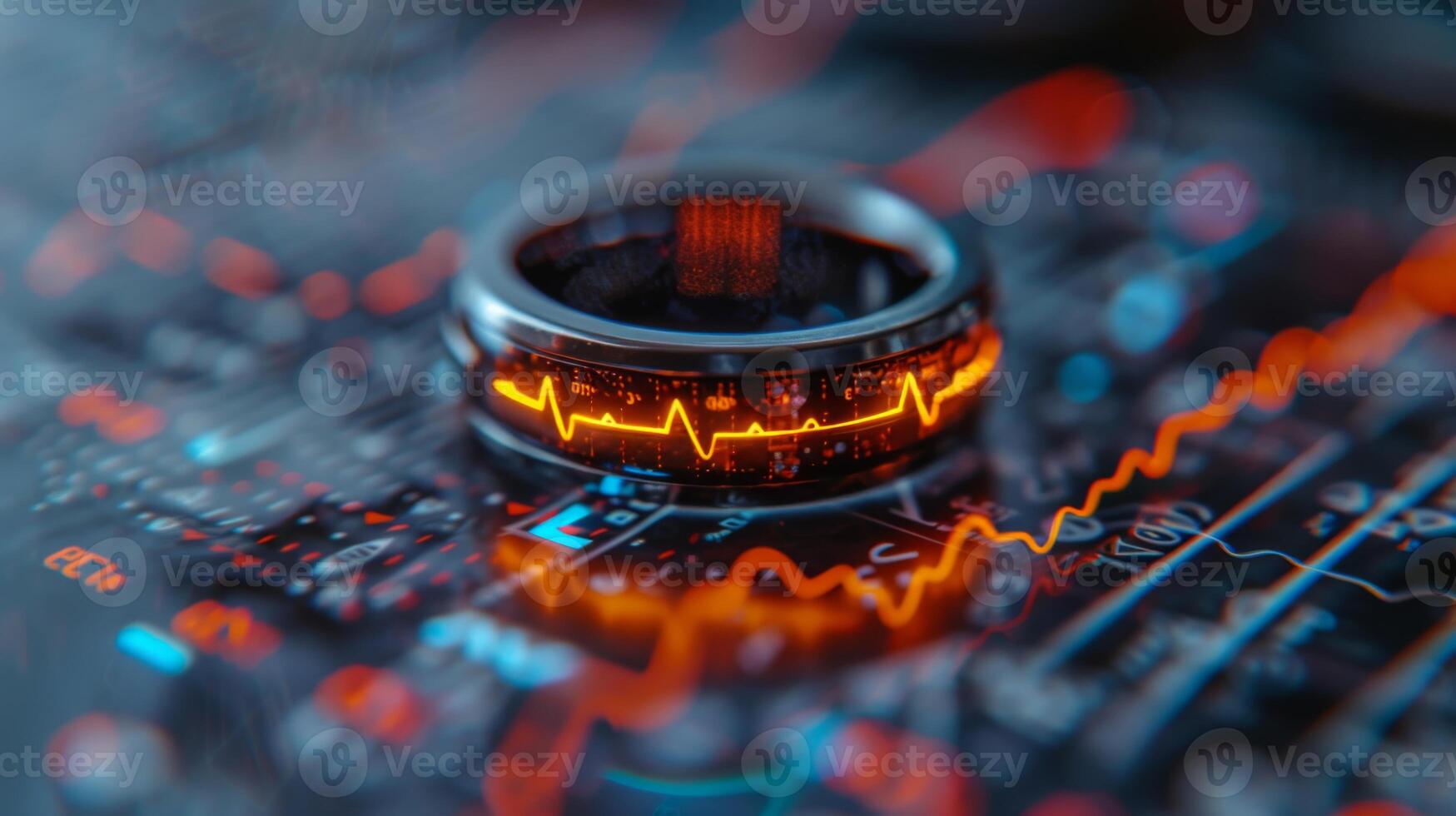 A close up view of a ring placed on a digital screen displaying colorful data patterns and heart rate visuals, reflecting the connection between technology and mental wellness. Pro Photo
