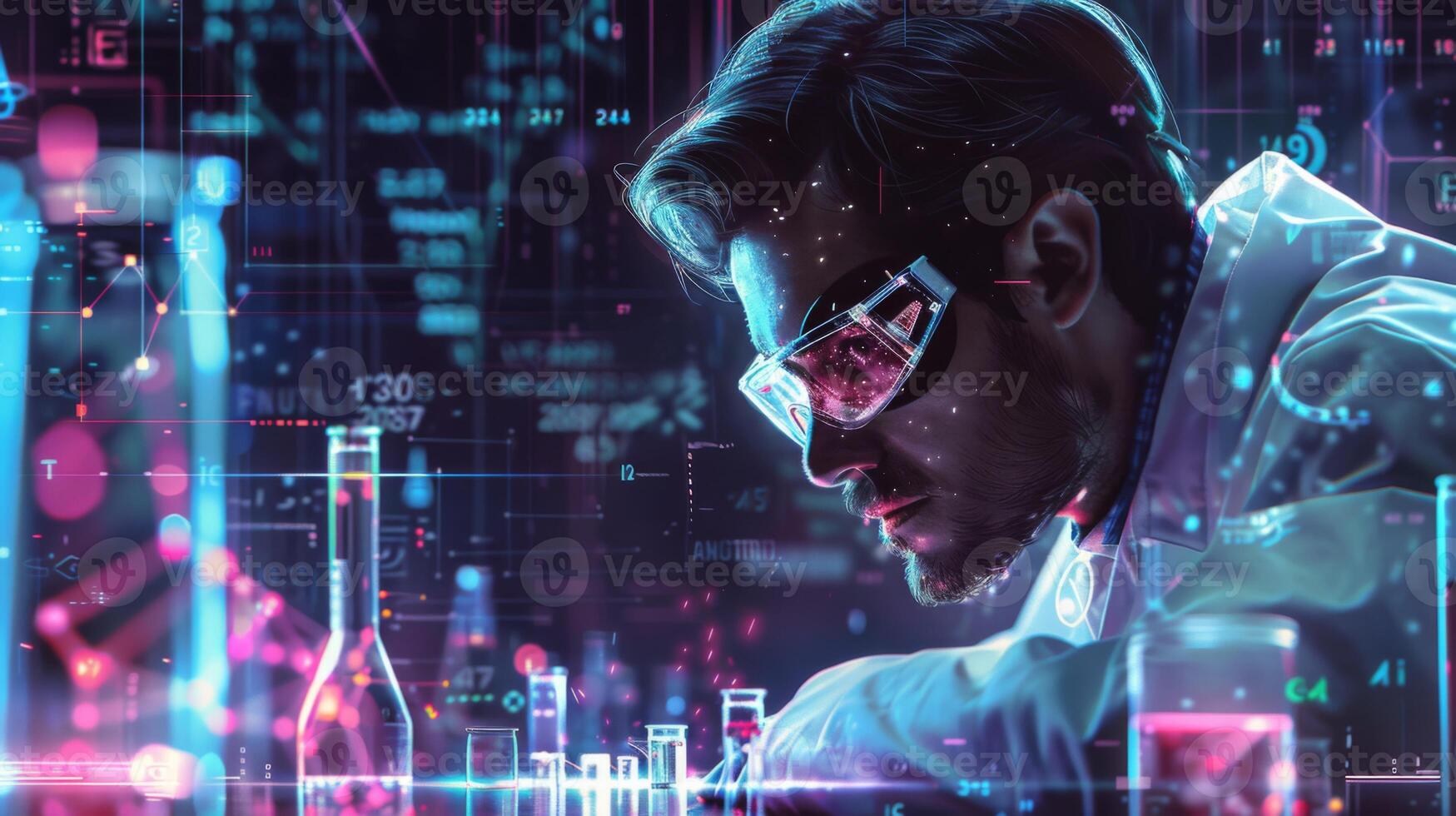 A focused scientist in protective eyewear examines samples in a modern laboratory, surrounded by glowing data visualizations and lab equipment during an advanced research session. Pro Photo
