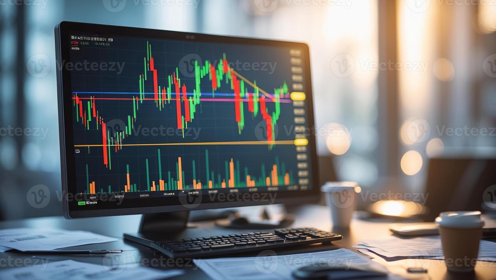 Financial analysis using stock market charts on a desktop computer during evening hours in a modern office setting Pro Photo