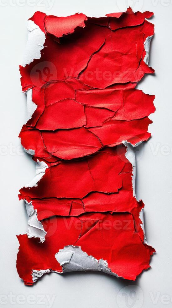 Textured layers of torn red paper create a striking abstract composition on a neutral background in bright lighting Pro Photo