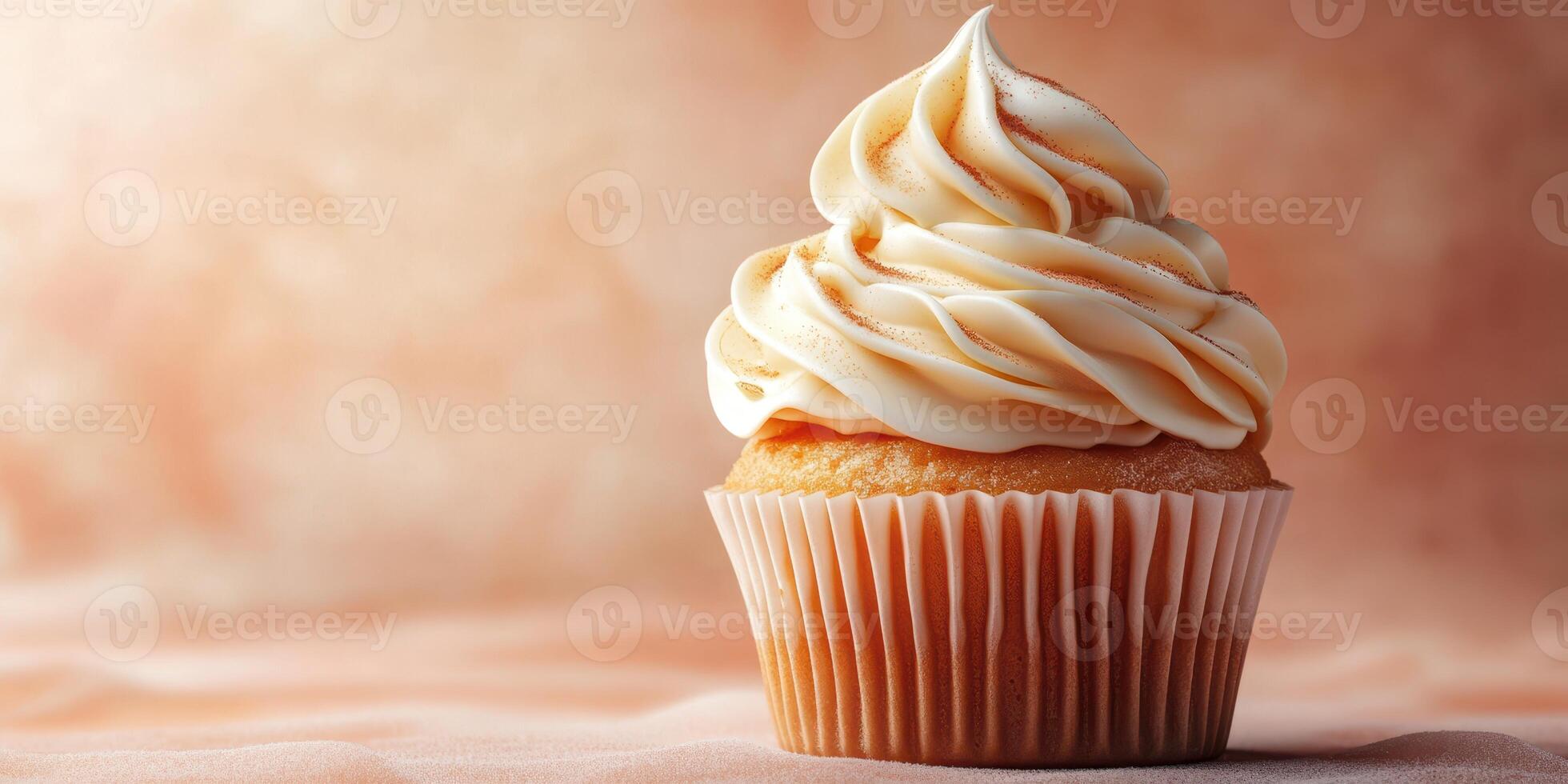 Delightful cupcake with swirls of vanilla frosting against a soft background showcasing its delicious texture and inviting appearance Pro Photo