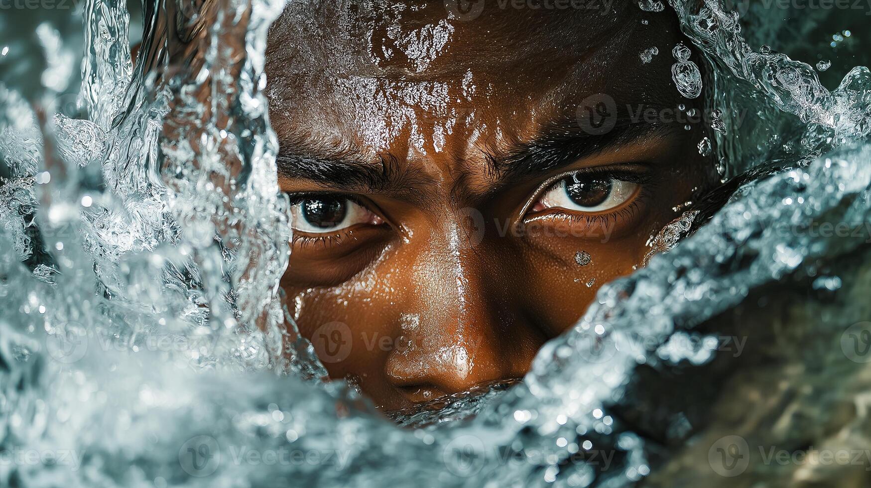 Close-up of a man face partially submerged in water with an intense gaze and splashing effect. Strength and resilience concept. Pro Photo