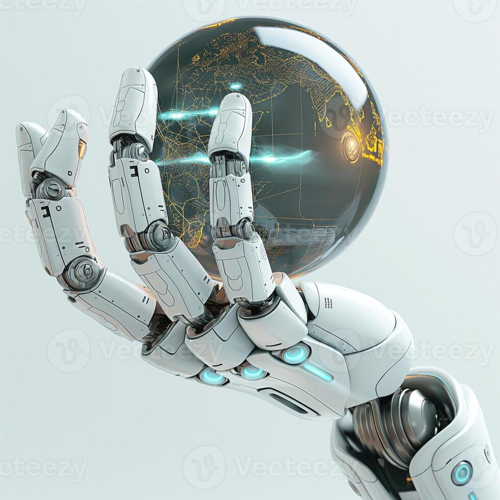 A futuristic robotic hand delicately holds a transparent globe displaying digital map data, symbolizing advanced technology. Pro Photo