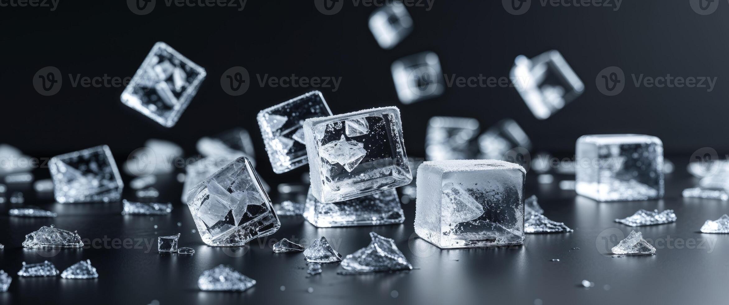 Scattered ice cubes and crushed ice on a black background with copy space for text inclusion. Pro Photo