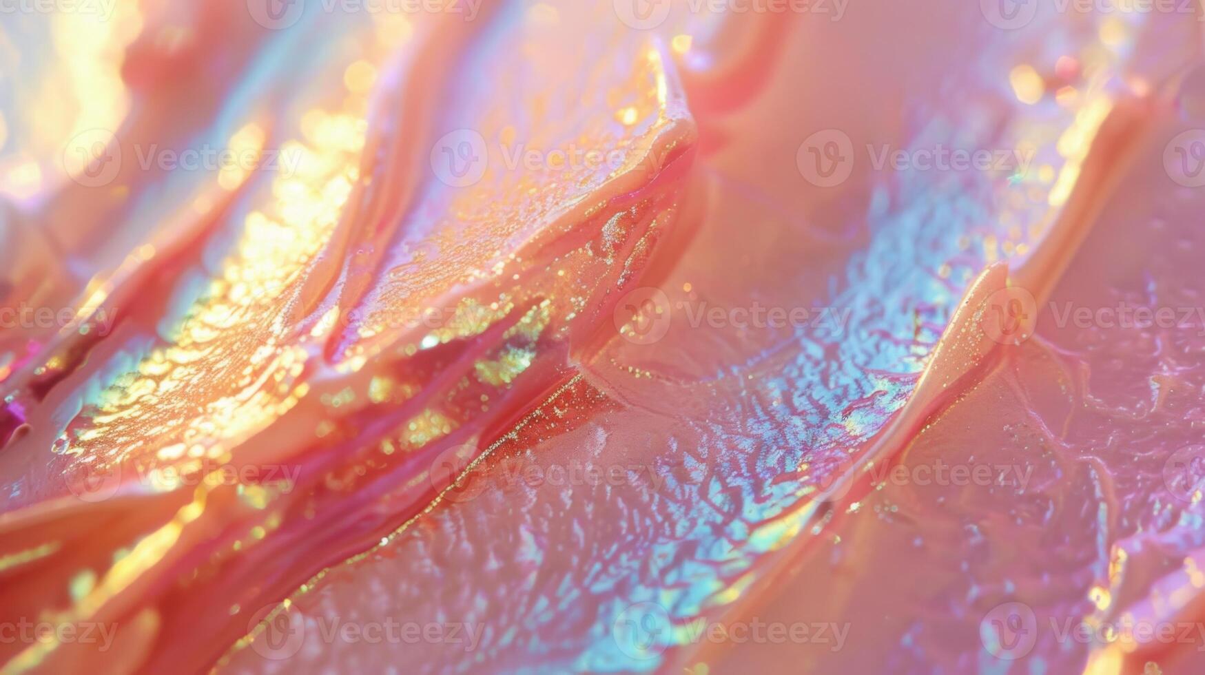 Light refracts through delicate water droplets, creating a shimmering effect on a glossy surface, showcasing a blend of pastel colors and textures in a tranquil environment. Pro Photo
