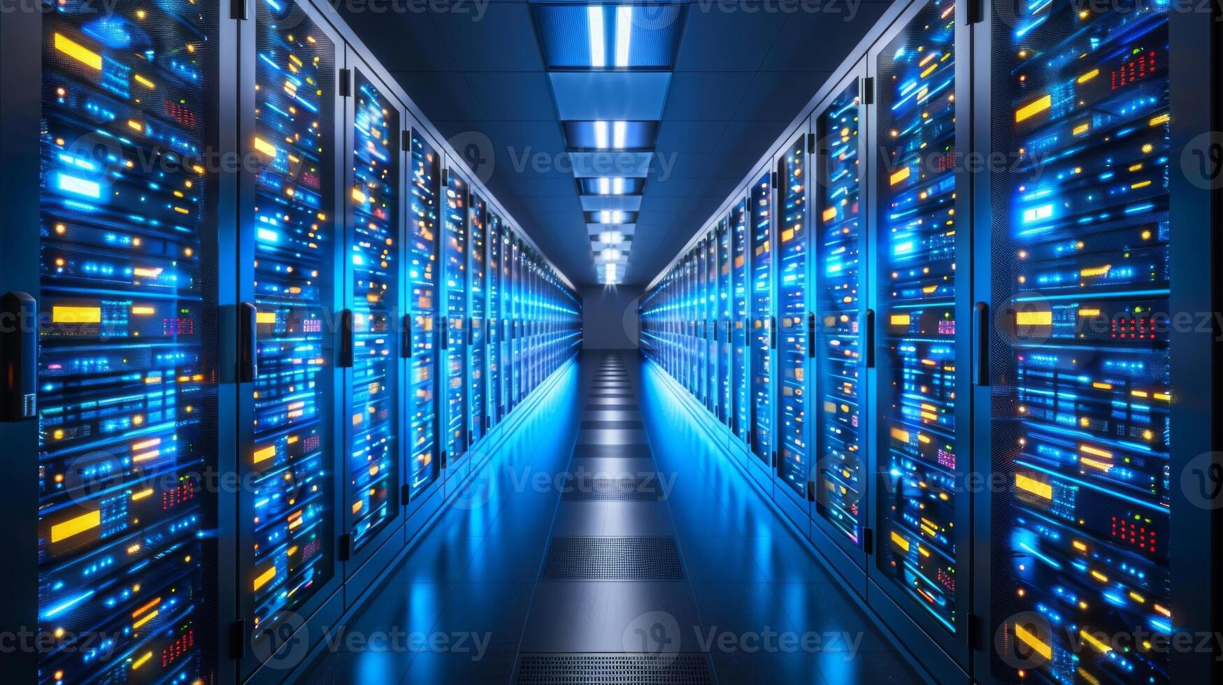 Rows of high tech servers are illuminated with blue and yellow lights in a sleek, modern server room, creating a futuristic atmosphere during late evening hours. Pro Photo