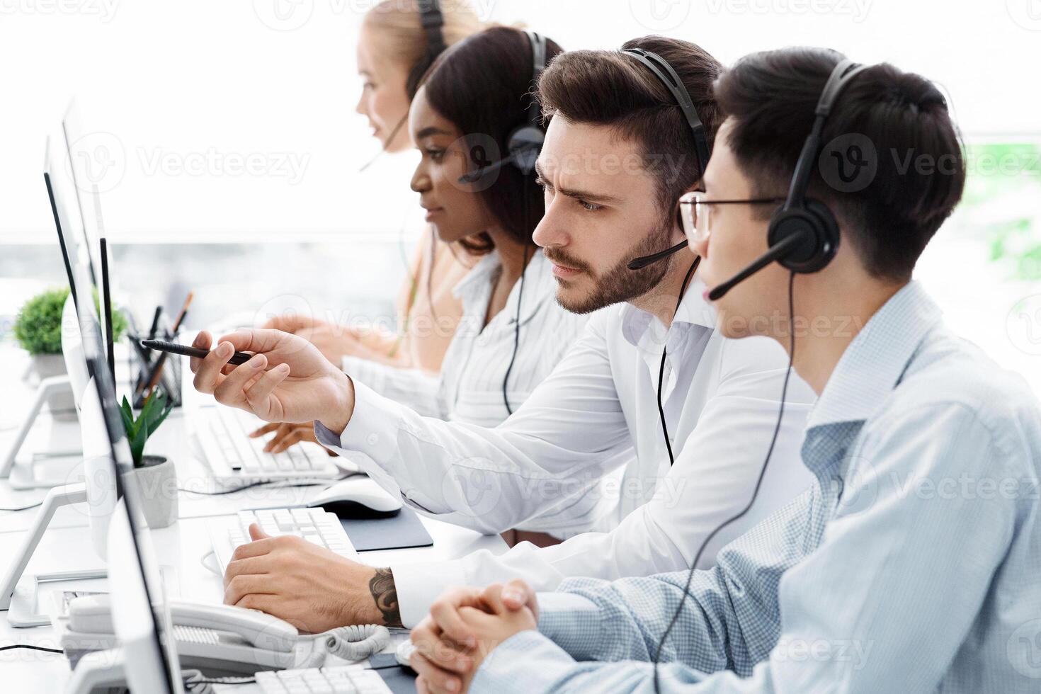 Technical support operators solving problem with client communication at call centre Pro Photo