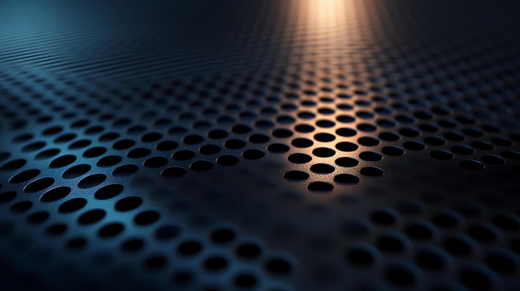 Close-up of a perforated metal surface, with a gradient light casting shadows through the holes, creating depth and visual interest. photo