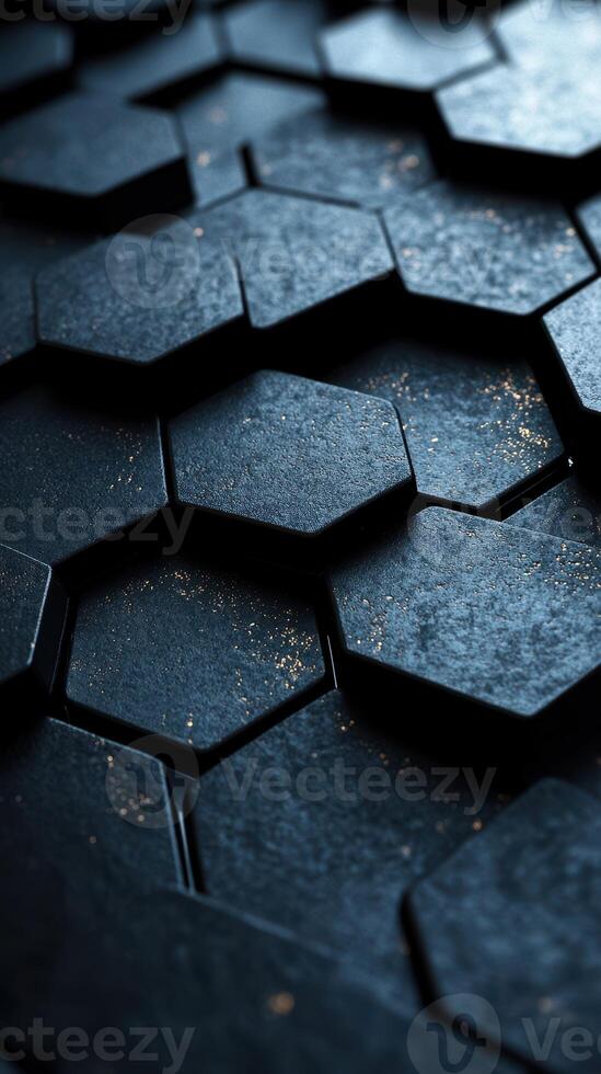 Textured black hexagonal tiles create an intriguing pattern with subtle light reflections in a dimly lit environment Pro Photo