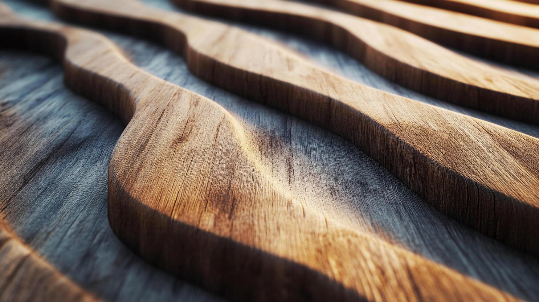 Textured wood surface with curved patterns, showcasing the natural grain and warm color variations with soft, diffused light. photo