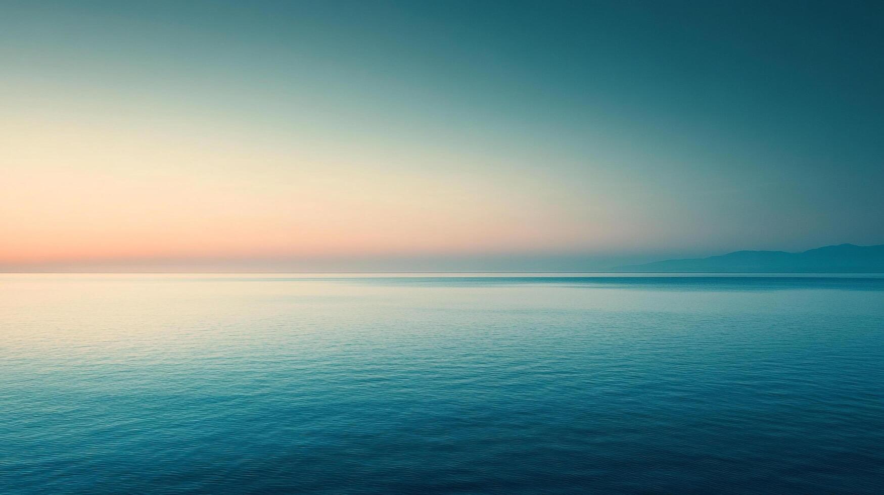 A serene seascape featuring a calm ocean reflecting a gradient sky at dusk, with distant mountains adding depth to the tranquil scene. photo