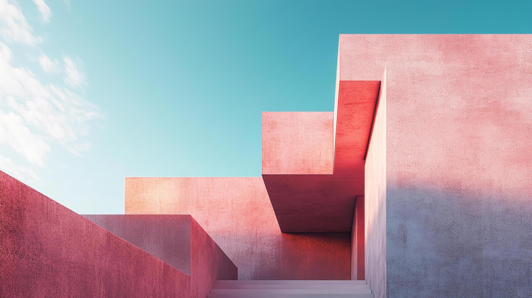 Abstract architectural design featuring angular pink concrete forms against a serene blue sky, capturing a blend of modern art and structure. photo
