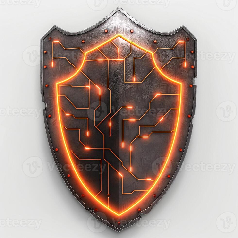A metallic shield illuminated with glowing circuit patterns, symbolizing technology and protection. Pro Photo