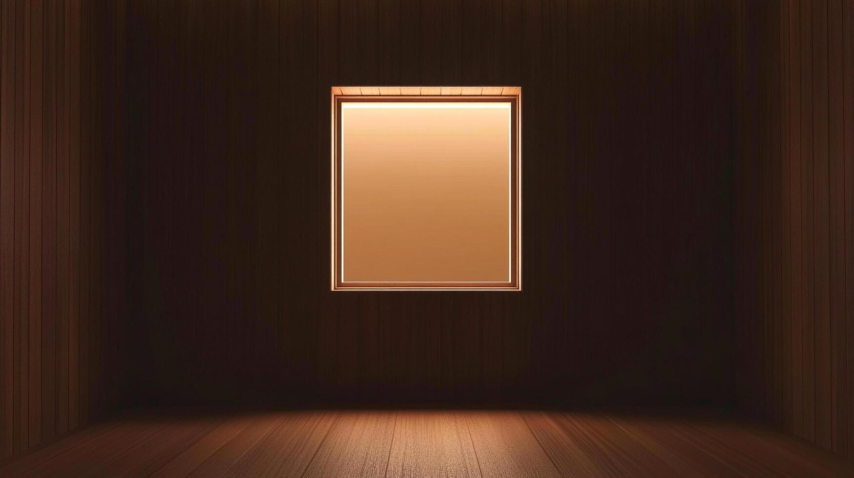 A warm, empty room with wood paneling and a framed light source at the back, creating a sense of minimalist simplicity and focus. Free Photo